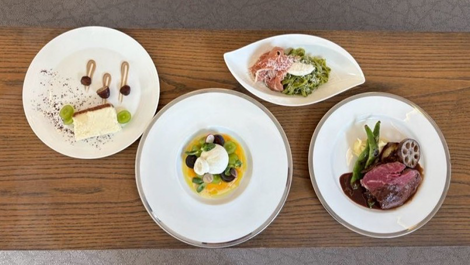 出張シェフプランでは、シェフがこだわってセレクトした地元信州・群馬の旬食材を活かした美食のコースディナーをご用意しています。メニューは季節によって変わりますが、例えば秋の季節は以下のような構成です。