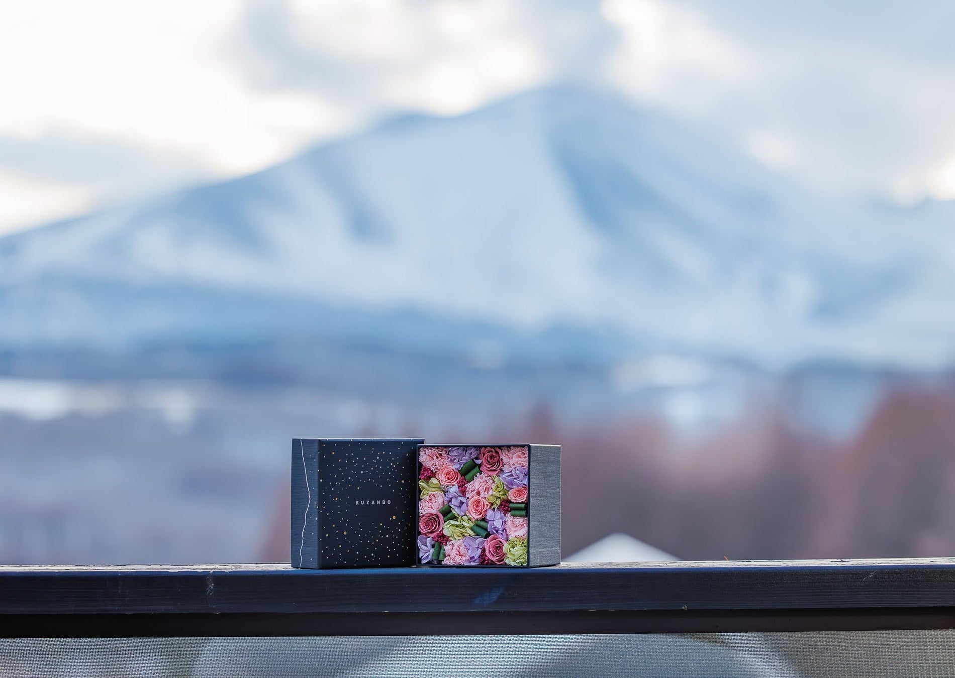 開業5周年を記念し、特別デザインのフラワーボックスも制作されました。箱の側面には浅間山のシルエットをモチーフにしたデザインが施され、花だけでなくパッケージ全体で自然とのつながりを表現しています。作品には約20種類の花や葉が使用され、どの角度から見ても美しく見える丸いフォルムを大切にしたデザインとなっています。